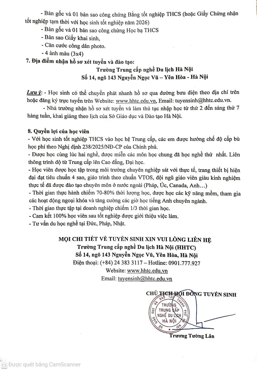 TRƯỜNG TRUNG CẤP NGHỀ DU LỊCH HÀ NỘI TUYỂN SINH LỚP 10 NĂM HỌC 2026 – 2027
